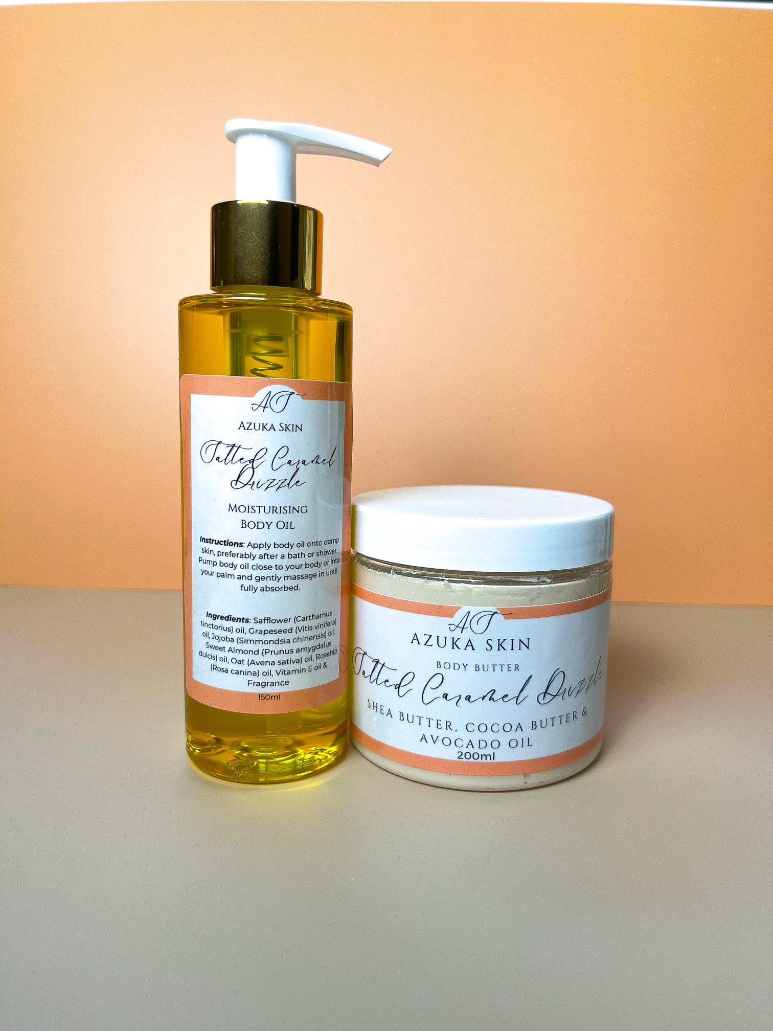 Have a bit of a sweet tooth? Why not try out the Salted Caramel Drizzle Bundle! Get both body butter and body oil to step into the soft and sweet notes of date syrup, toffee and caramel and the lactonic notes of vanilla and salted butter. A sweet treat for your body skin. Treat yourself to this curated blend for those moments where softness and femininity come into play- indulge is sweet aromas that give you and your skin comfort, softness, warmth and glow!